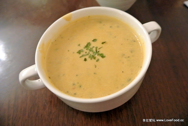最後,則是很常見的義式焗烤燉飯了,而點焗烤真的要等很久很久阿,不過味道真的超香的,他烤得還算不錯,燉飯不會說太過濕濕水水,而餐點還會附一碗湯,當日的湯是很濃郁的南瓜湯。